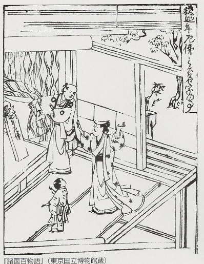 In Edo, in the vicinity of Nipponbashi (modern day Tokyo), there was an important shopkeeper named Kenhei. Every year Kenhei would make a trip to Kyoto to buy stock for his store, always buying from the same seller, a widow women living with her daughter. This daughter had stolen the heart of Kenhei, and she had no plans to give it back. So, with the consent of the mother, they were pledged.