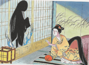The answer came at last with a rattle of the paper screens that served as a wall between Uriuno’s bedroom and the garden, and the figure of a woman projected like a shadow against those screens. The mysterious shape bowed down and whispered expressions of gratitude to Uriuno. Just as Uriuno was about to raise her voice in response, the figure blinked out of existence.