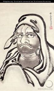 The historic Daruma comes from 5th or 6th century AD. Most of his life is so completely wrapped in legend it would be impossible to sort fact from fancy, but he is often considered to have come from South India, or “from Persia.” Whatever his origin, he is the divine transmitter of Ch’an Buddhism, known in Japanese—and English—as Zen Buddhism. In art, he is depicted as being grumpy, ill-tempered, scowling, with a beard and deep-set eyes.