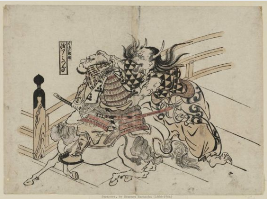 Yorimitsu had business in the town of Ichijo Omiya and dispatched Tsuna as a messenger. Tsuna arrived on horseback in the dead of night, the famous sword Higekiri (Beard Cutter) tucked into his obi. He planned a short trip, and to soon return with a message for his master. Yet when he crossed the Modari Bridge over the Hori river, on the Eastern side he saw a beautiful woman of a bit more than 20 years of age. Her skin was as white as new-fallen snow, so much that she had the visage of a yurei. Yet he saw the flair of her under-kimono peeking out—red as the red-blossomed plum tree. She bore a sash across her chest, and a sutra in the folds of her sleeves.