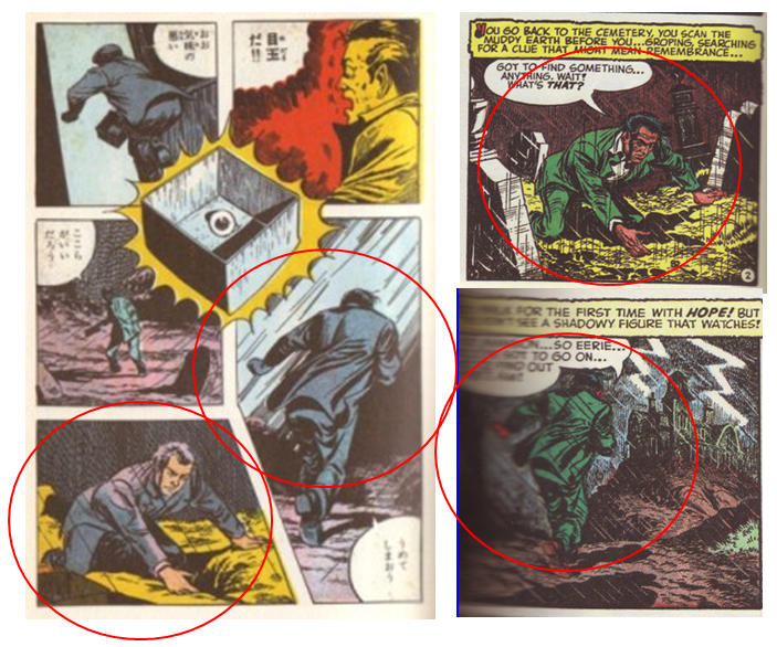 These first images come from the 1959 kashihon comic Yokaiden by Mizuki Shigeru. There can be no mistake that Mizuki took several of the poses and faces directly from Warren Kremmer’s 1953 comic Amnesia. The poses are identical, even though they are being used for different story elements.