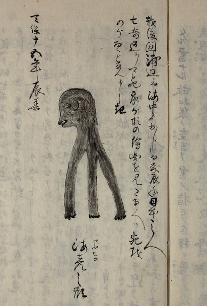 The official drew an illustration of what he saw, showing a chimeric creature with a bird’s beak, fish scales, long hair, and three finned feet. The story and illustration were printed in kawaraban woodblock-printed broadsides and disseminated across Japan.
