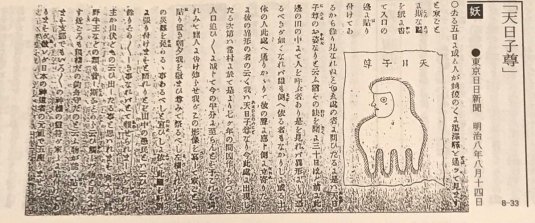 This version comes from Yuwaza in Nigata prefecture, and appeared in the Tokyo Nichi-Nichi newspaper in Meiji 8 (1875). This version was said to have appeared in a rice field. The illustration shows something like a four-legged version of a daruma doll. This version carries the name of “mikoto” identifying it as something holy, and it professed to be a servitor of the heavenly gods.