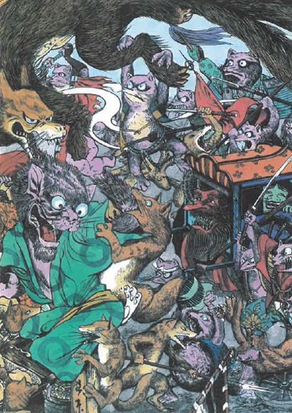 The depiction of tanukis evolved slowly, with new stories adding new elements and transforming them slowing from the realistic animals to the cartoonish figured seen all over Japan today. The big round stomach and accompanying belly-drumming didn’t become attacked to tanuki lore until the 18th century. Several stories of tanukis’ belly-drumming appear around this time, although their famous nut sacks are still regular size. They didn’t develop elephantitis until later.