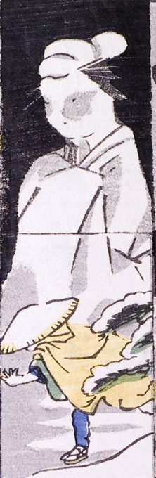 Some accounts say that the Yuki Onna is not a Spirit of Snow, but the ghost of a woman seeking revenge. This mainly comes from Chikamatsu Monzaemon’s bunraku puppet play Yuki Onna Gomai Hakoita (雪女五枚羽子板; The Five Battledores of the Yuki Onna). In Chikamatsu’s play, the Yuki Onna is the ghost of a woman who was deceived, lead into the forest, and murdered. She manifests as the Yuki Onna in order to get her revenge.